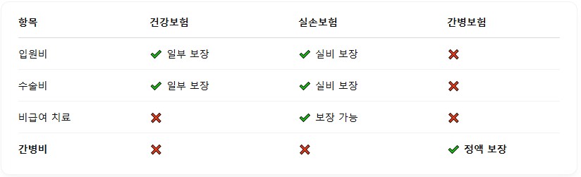 - 반면, 간병비는 공적 보험이나 실손보험에서 단 10원도 보장되지 않습니다.