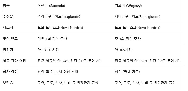 - 위고비: 주 1회 투여로, 삭센다에 비해 투여 빈도가 낮아 편의성이 높습니다.