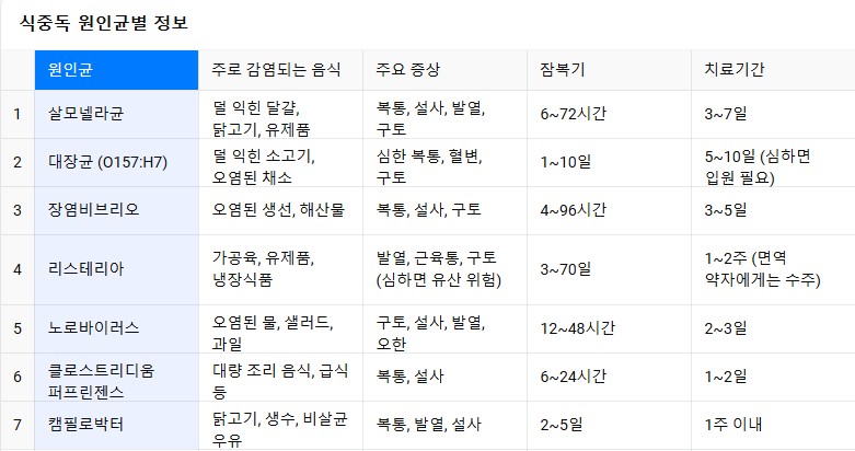 - 식중독 잠복기: 1시간~72시간 이상까지 다양